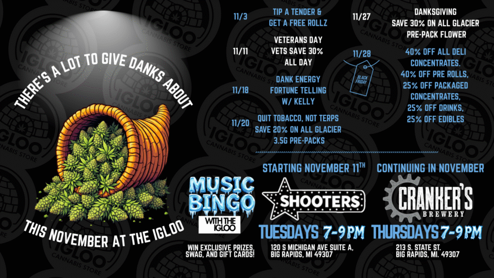 BUNDLE UP! November is packed with dope deals and exciting events at The Igloo Cannabis Store in Big Rapids Michigan. We have a full calendar of events and discounts for