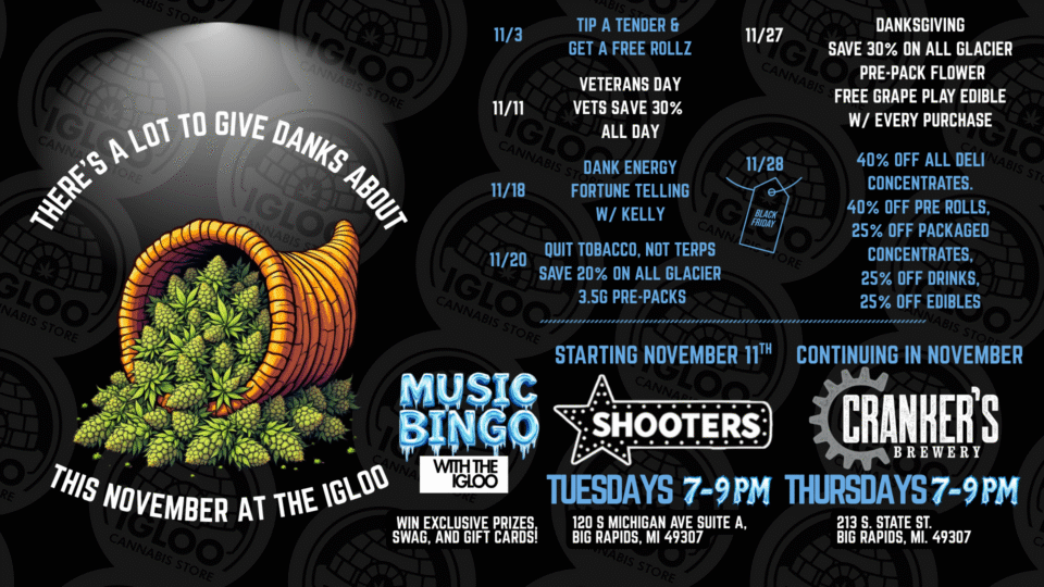 BUNDLE UP! November is packed with dope deals and exciting events at The Igloo Cannabis Store in Big Rapids Michigan. We have a full calendar of events and discounts for